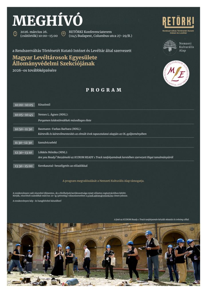 A Magyar Levéltárosok Egyesülete Állományvédelmi Szekciója továbbképzést szervez a Rendszerváltás Történetét Kutató Intézet és Levéltár társszervezésében 2026. március 26-án.
