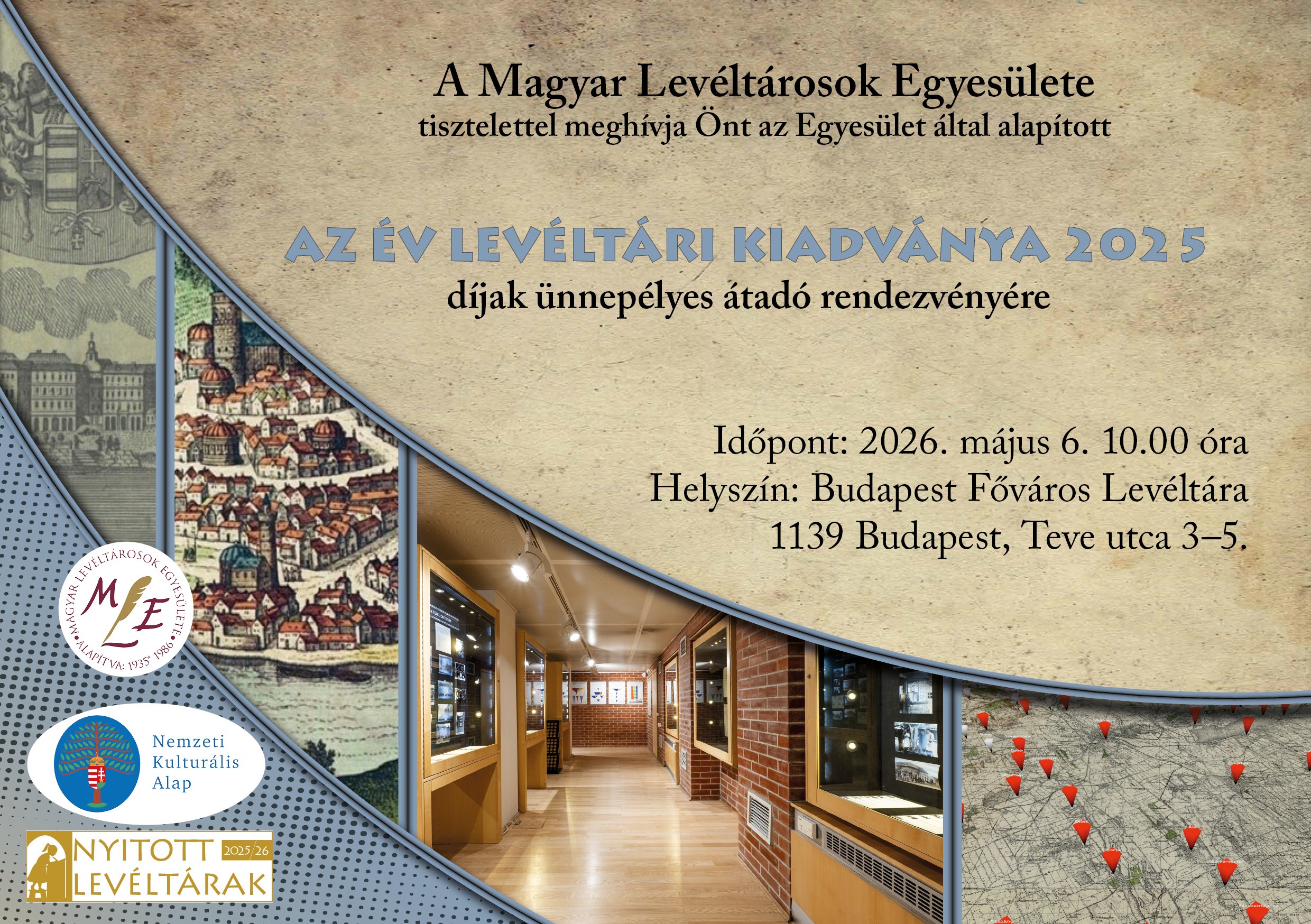 2026. május 6-án, szerdán kerül sor a Magyar Levéltárosok Egyesülete által alapított ÉV LEVÉLTÁRI KIADVÁNYA 2025 díjak ünnepélyes átadó rendezvényére. Időpont: 20265. május 6. 10.00